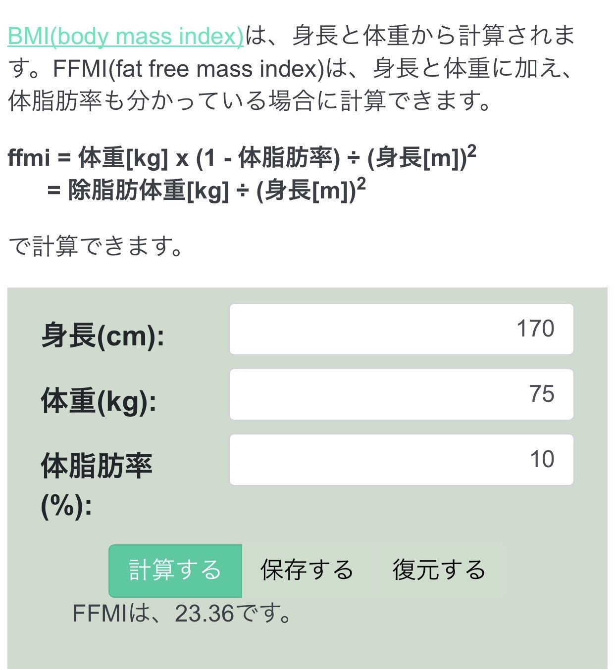 ゆもz 筋トレでカッコいい体作ろうぜ A Twitter Bmiは 筋肉量を一切考慮しないから マッチョは肥満扱い これからは 正しく数値化するためにffmiという指標がフィットネス界では有名になってくるだろう 身長 体重 体脂肪率 この3つで計算する 計算サイト