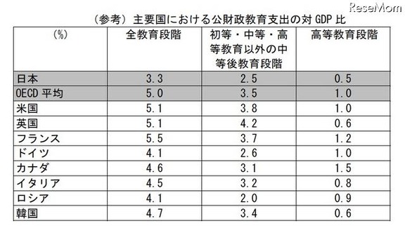 日本の教育への公的支出 34か国中最下位 国別割合比較表 リセマム